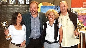 Blondschopf Natascha Kames (Presse) und Vojtech Matejcek (Präsident Golfclub Beroun, links) mit den Dreitages-Siegern der Pressegruppe: Elisabeth und Rainer mit Beroun-Pokalen.